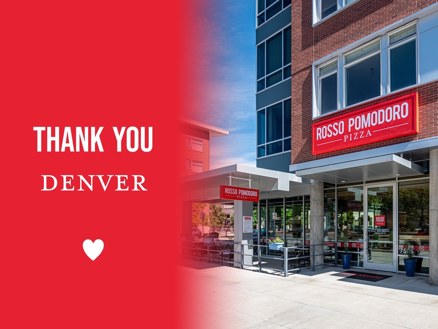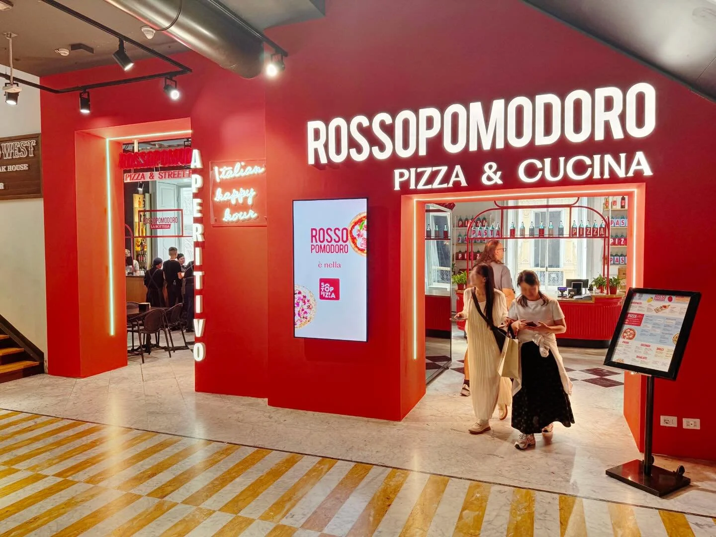 Red background sign with white text reading "ROSSO POMODORO PIZZA"